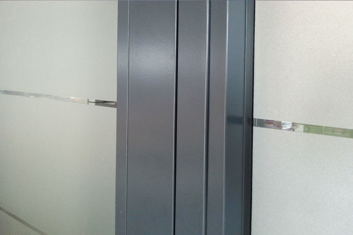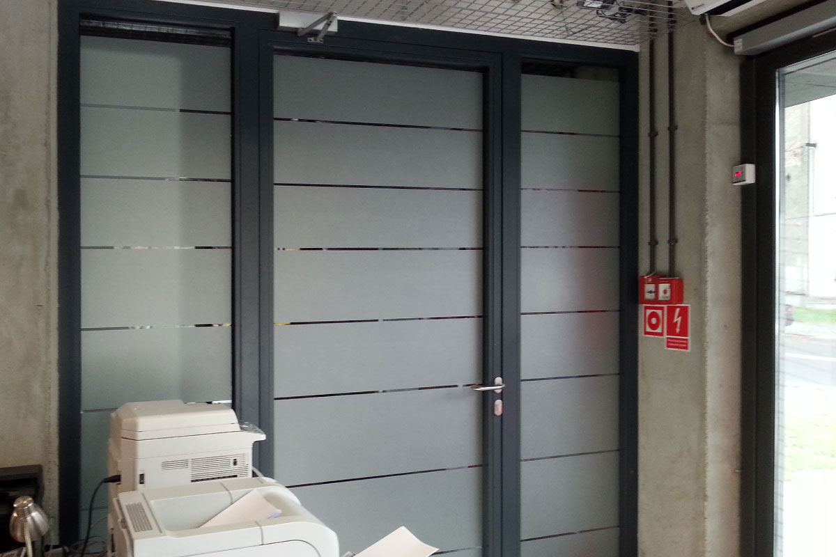 Aplikacja folii matowej szkło mrożone w siedzibie firmy medi Polska w Gliwicach. Szklane drzwi zostały w całości zaklejone poziomymi pasami wyciętymi w folii.