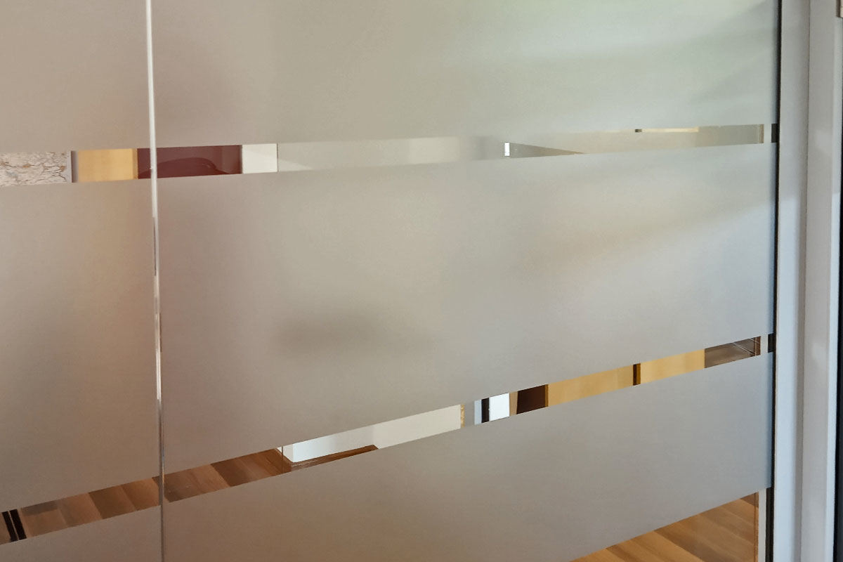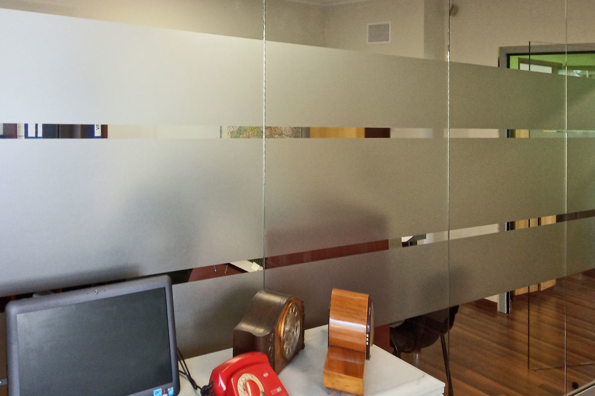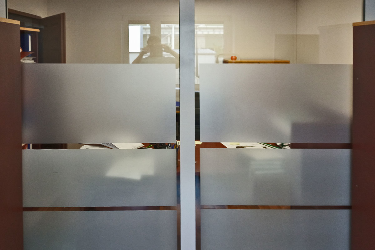 Aplikacja folii matowej szkło mrożone na szybach i przeszkleniach w siedzibie firmy Siga Serwis w Radzionkowie.