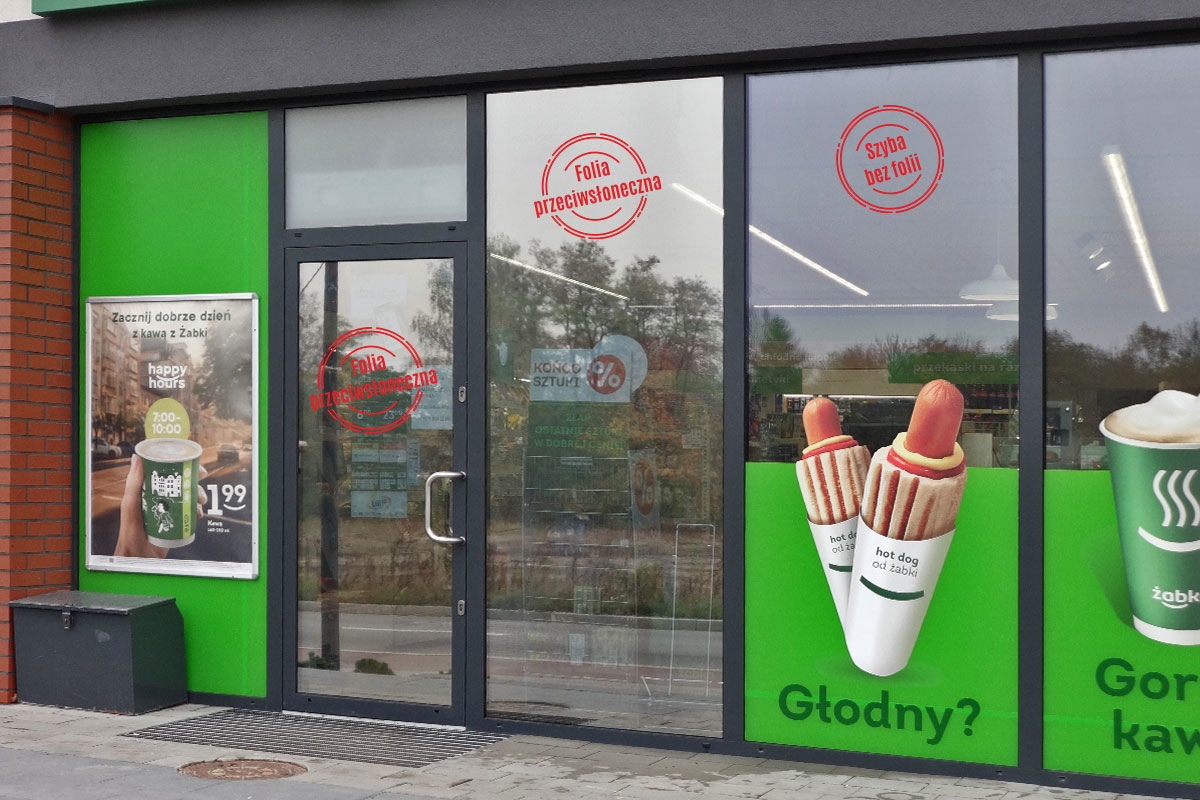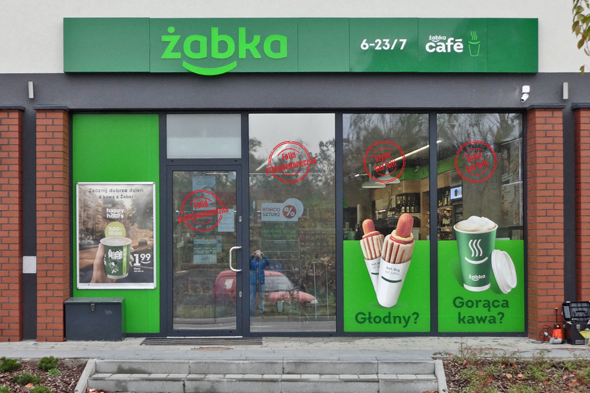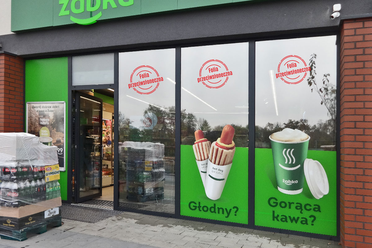 Oklejenie sklepu Żabka w Katowicach folią przeciwsłoneczną zewnętrzną lustrzaną- średnie lustro o parametrach: